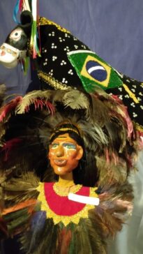1-As experiências estão relacionadas às brincadeiras dos festejos juninos no Maranhão, onde realizamos o auto do bumba meu boi; 2-Tratase da representação do Boi, onde a "capoeira" é recoberta com o "couro" bordado com. miçangas, canutilhos e paetês. Quando o boi está em cena, dança ao som as toadas e instrumentos percussivos, pois em baixo dele, há um dançarino chamado de "miolo". Ao lado do boi, um boneco representando o Caboclo de Pena, um dos personagens que compõem o boi do Sotaque Matraca ou Ilha; 3-Estes objetos fazem parte do acervo da Cia. Beto Bittencourt, com mais de 250 bonecos, com os quais estou convivendo durante o isolamento, construindo também outros 40 bonecos, pois a Cia. é sediada em minha residência; 4-Neste isolamento que já dura quatro meses, as memórias dos festejos juninos que não puderam acontecer neste ano, são representadas pelos bonecos, elementos do Bumba-meu-boi e outras brincadeiras desta época, divulgados nas redes sociais; 5-O objeto é importante porque faz parte da cultura de raiz dos maranhenses, cujo Complexo do Bumba-meu-boi é Patrimônio Cultural imaterial da humanidade. 6-Essa história deve ser lembrada e demonstrada, por se tratar de aspectos culturais essencialmente dos nossos ancestrais indígenas e africanos. Vale ressaltar a grande diversidade cultural do estado do Maranhão, pois que somente o Bumba meu- boi, possui mais de duzentos grupos, subdivididos nos sotaques Zabumba, Costa de mão, Baixada, Orquestra e Matraca, cada qual com suas peculiaridades em indumentária, ritmo, instrumentos, etc. Além destes, têm os grupos de Boi alternativo, com a liberdade de executar todos os sotaques, produzir seu próprio espetáculo e show. Por tudo isto, essa história deve ser sempre lembrada. Conjunto composto por representações de festas juninas no Maranhão.