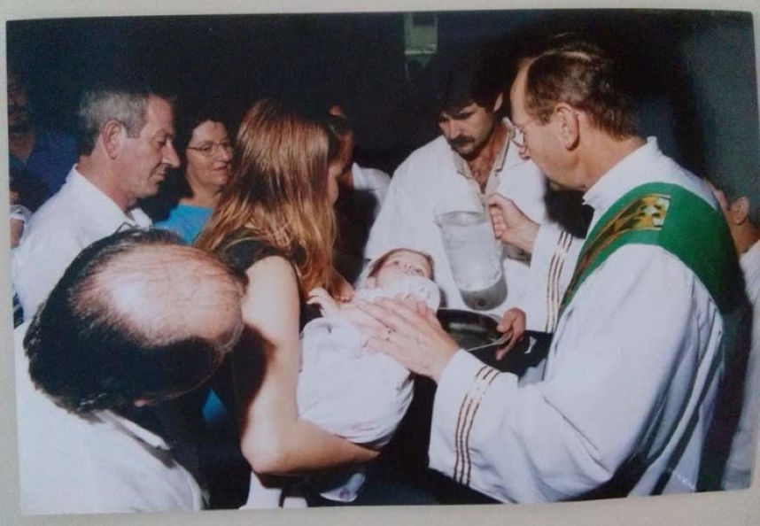 Foto onde aparece o batizado de um bebê. Há várias pessoas assistindo o ritual. O Bebê está no centro da foto, no colo de uma mulher enquanto um homem segura uma bacia sob sua cabeça. O padre está com umas das mãos posicionada sobre o corpo do bebê enquanto, com a outra mão, segura uma jarra de água levemente inclinada sobre a cabeça do mesmo.
