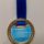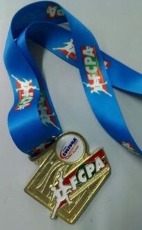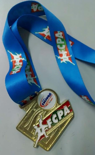 Medalha dourada retangular contendo um círculo em no lado direito superior, com a inscrição CULTURA em azul e fundo branco com alguns rabiscos em vermelho. Na diagonal, imitando uma faixa, em vermelho e verde, a silhueta em branco de bailarinos e a inscrição em “FCPA” em branco. A medalha está pendurada em uma fita de cetim na cor azul contendo serigrafias da marca.