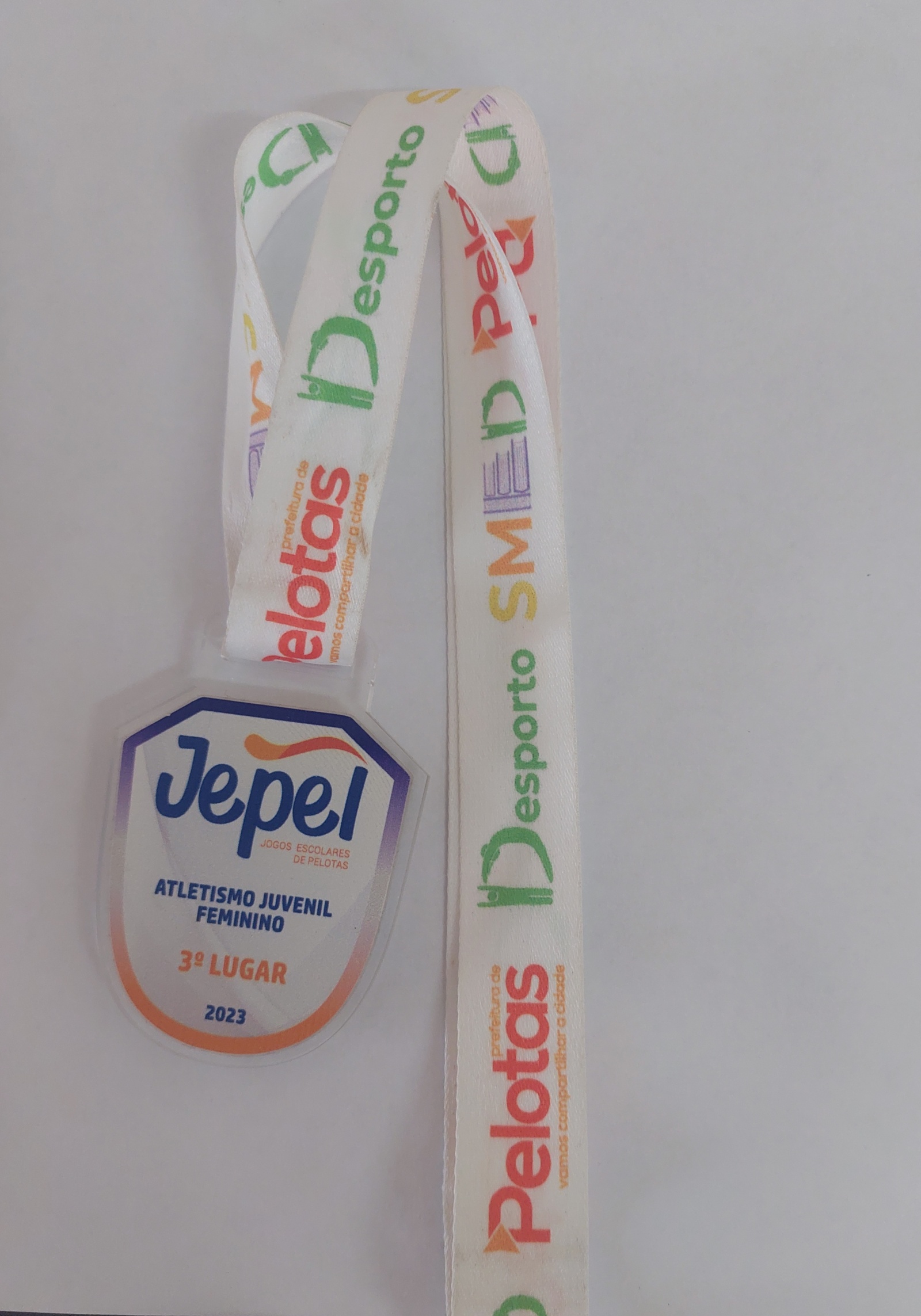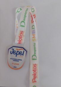 A imagem mostra uma medalha com fita. A fita esta enrolada parcialmente ao redor. A parte frontal da medalha está visível, com o seguinte texto impresso:"Jepel - JOGOS ESCOLARES DE PELOTAS - ATLETISMO JUVENIL FEMININO. 3º LUGAR- 2023". A fita branca que acompanha a medalha apresenta repetições das palavras e logomarcas: "Desporto", "SMED", "Pelotas", "Prefeitura de Pelotas – vamos compartilhar a cidade", em cores variadas (verde, laranja, vermelho, roxo). A medalha está ambiente interno, com fundo liso e claro, possivelmente uma superfície branca de papel ou mesa.