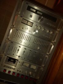 Aparelho de som modulador feito em metal na cor prateada dividido em cinco caixas retangulares empilhadas uma em cima da outra com diversos botões. Possui uma placa pequena preta com o nome da marca "CCE" em cada uma das caixas.