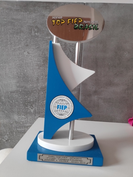 Troféu composto por uma base quadrada azul seguido por uma circular branca, possui 2 tubos de ferro que ligam ao topo onde se encontra uma base de lado oval em madeira com as seguintes descrições: "Prêmio" em branco, "Top FIEP" em amarelo, "2014-2015" em branco e "Brasil" em verde. Ao longo dos tubos de ferro possui duas placas de madeira em forma de meia estrela de 4 pontas, uma azul e uma branca, na azul possui um circulo branco em forma de mundo com as letras em azul "FIEP".