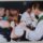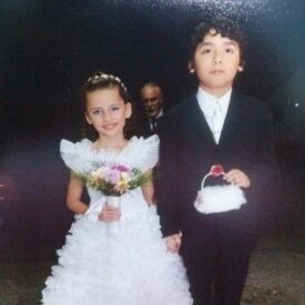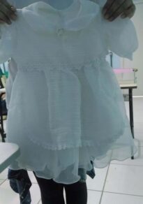 Mãos que seguram um vestido branco com manga curtas, franzido na cintura. A blusa do vestido tem duas golas no decote com rendas na borda e uma pequena flor no meio do decote. Na cintura tem um cinto todo feito com pequenas flores de renda na cor branco e um avental com renda na borda. O tecido é bem fininho e transparente com forro branco