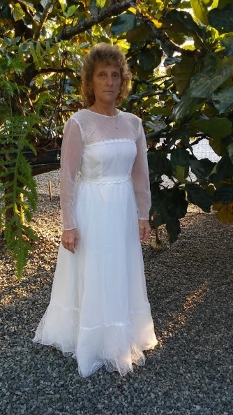 Fotografia de uma mulher de meia idade vestida de noiva, parada ao ar livre sob folhagens. A mulher tem cabelos loiros escuros e cacheados até o ombro, está parada em pé, com os braços soltos ao lado do corpo, o rosto sério. O vestido é longo, levemente armado, chegando até o chão, Os ombros e as mangas longas são de um tecido transparente. Há detalhes como babados na bainha, mas é um vestido relativamente simples.