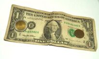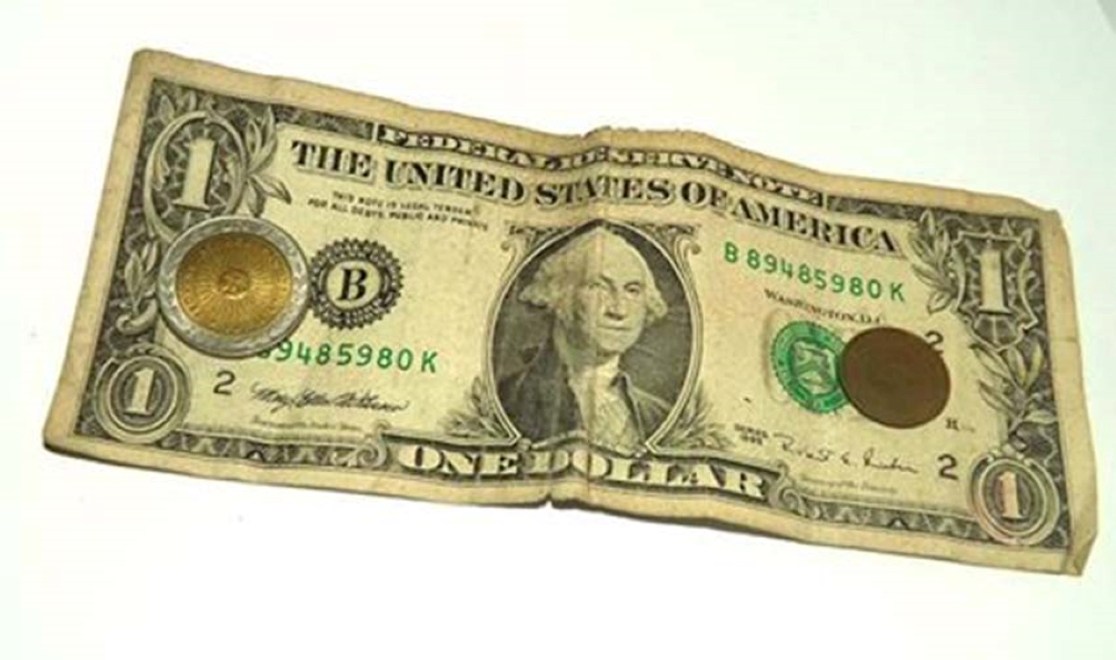 Nota de 1 dolar e duas moedas. A nota está aberta e as duas moedas estão sobre ela, uma em cada extremidade da nota. No topo da nota está escito "The United States of America", ao centro está a figura de um homem, e na parte inferior está escrito "one dollar". Tanto a nota como as moedas estão com marcas do uso e do tempo.