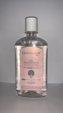 Recipiente de plástico transparente com tampa branca para álcool em gel. Possui um adesivo com fundo rosa na parte frontal do recipiente onde esta escrito na parte superior a sua marca "GIOVANNA BABY".