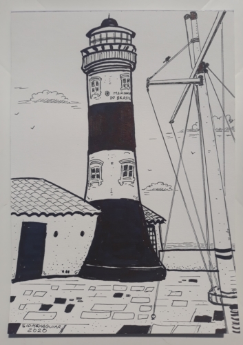 Salvador é sem dúvida uma das cidades mais maravilhosas do Brasil. A primeira capital brasileira tem um patrimônio histórico invejável. Dentre estes monumentos da História tupiniquim está o Farol da Barra que fica localizado no Forte de Santo Antônio da Barra. Esta fortificação militar foi construída no século XVI e hoje está sob a responsabilidade da Marinha do Brasil. Quando estou em terras soteropolitanas sempre visito o Museu Náutico da Bahia que está instalado nas dependências do Forte e trata-se, de uma atividade lúdica e pedagógica para jovens e adultos. Produzi esta linda ilustração a partir de uma fotografia tirada por mim na última estada que fiz com minha esposa ao local no início deste ano de 2020 em viagem de férias. Descrição do Objeto Ilustração produzida com caneta nanquim Faber-Castell nº 0.6 e pincel marcador permanente e recarregável de cor preta (Bic Marking) sobre papel Canson branco, tamanho A4 de 200 g/m², medindo 210mm X 297mm.