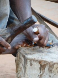 Imagem de um artesão moçambicano confeccionando um chaveiro.