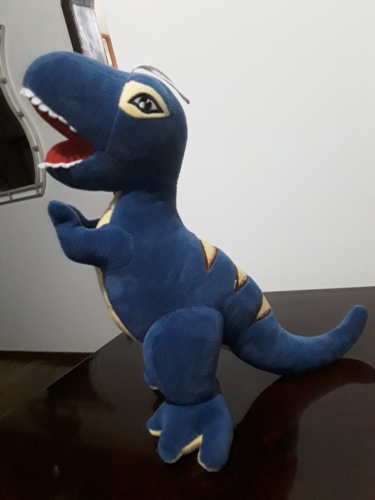 Boneco tipo pelúcia na forma de do dinossauro Tiranossauro Rex. Colorido com o corpo na cor azul e detalhes na cor amarela. Esta de pé com a sua boa aberta.