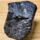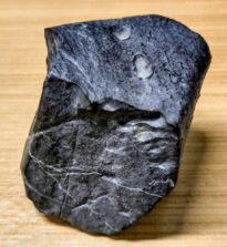 A imagem mostra uma pedra de cor grafite ,que apresenta algumas ranhuras, fendas e alguns orifícios