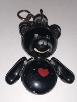 Chaveiro em formato de urso. Possui o corpo na cor preta e um detalhe em forma de coração na cor vermelha. Apresenta marcas de desgaste na pintura e não possui as pernas.