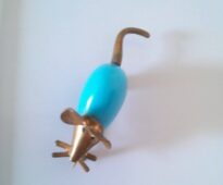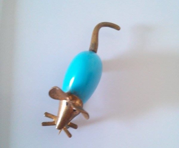 Há alguns anos minha avó, minha mãe e eu nos sentamos para mexer nos pertences da cômoda de minha avó. Haviam várias caixinhas, latinhas, pacotinhos com brincos, broches, penduricalhos em geral. Este chamou minha atenção, uma gracinha de rato. Minha avó disse que era mais antigo que minha mãe e que eu poderia ficar com ele se soubesse cuidar. Está comigo desde então. Nunca usei, pois tenho medo de perde-lo. É importante para minha avó, é importante para mim.