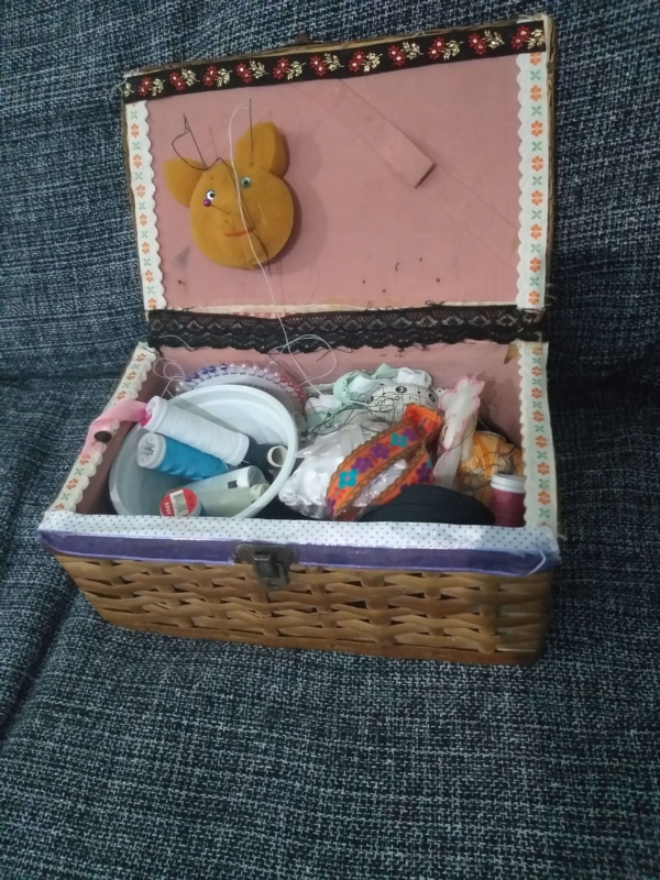 Caixa de costura feita de material transado, forrada com tecido na cor rosa e laterais branca. Possui diversos carreteis de linha de varias cores e almofadas para agulha. Se destaca uma almofada presa na parte interna da tampa no formato de um rosto de animal feliz na cor amarelo queimado, com orelhas, olhos azuis e um sorriso com a boca na cor vermelha.