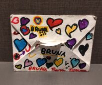 Envelope na cor branca, ilustrado com vários corações coloridos. Nele está escrito o nome Bruna 3 vezes e "para Bruna"