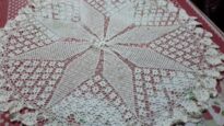 Toalha de mesa feita em crochê com detalhes de uma estrela de 8 pontas na cor branca.