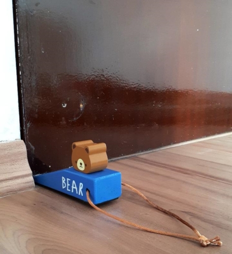 Faz quase um ano que aluguei o apartamento no qual moro sozinha. Lembro da primeira impressão, pensada em voz alta para trazer boa sorte: Serei muito feliz aqui! disse. Ainda não é possível confirmar resoluções dessas palavras. Talvez o que ocorreu no primeiro dia de mudança possa ser o indício do estado de espírito necessário para viver/sobreviver na ilha que este espaço se tornou, quando um casal de amigos que conheci nos tempos da faculdade se padeceu em ajudar a colega, sozinha em uma nova cidade. Entre o sobe e desce das escadas, carregando as caixas, Leonardo notou que a porta de entrada batia com o vento, mesmo fechada. Solícito, pregou adesivos de feltro no batente da porta, mas, ao testar a eficácia desta engenhosidade, encerramos aquela tarde com a chave quebrada dentro da fechadura e uma porta que insistia a bater. A mudança foi finalizada e a amizade permanece segura à distância. Que ironia o isolamento social ser um ato de amor. Só não é maior que a ironia da porta que até dias atrás era insistente ao menor indício de ventania. No supermercado, toda mascarada, ao passar pelo caixa, acho um aparador de porta entre itens de desistência de outros compradores e lembro que preciso me esforçar um pouco mais para habitar a ilha. Quem sabe, brevemente, a campainha seja o único sinal de que algum amigo está à porta. Aparador de porta feito em madeira, colorido com a caixa em azul e escrito "BEAR" em branco.