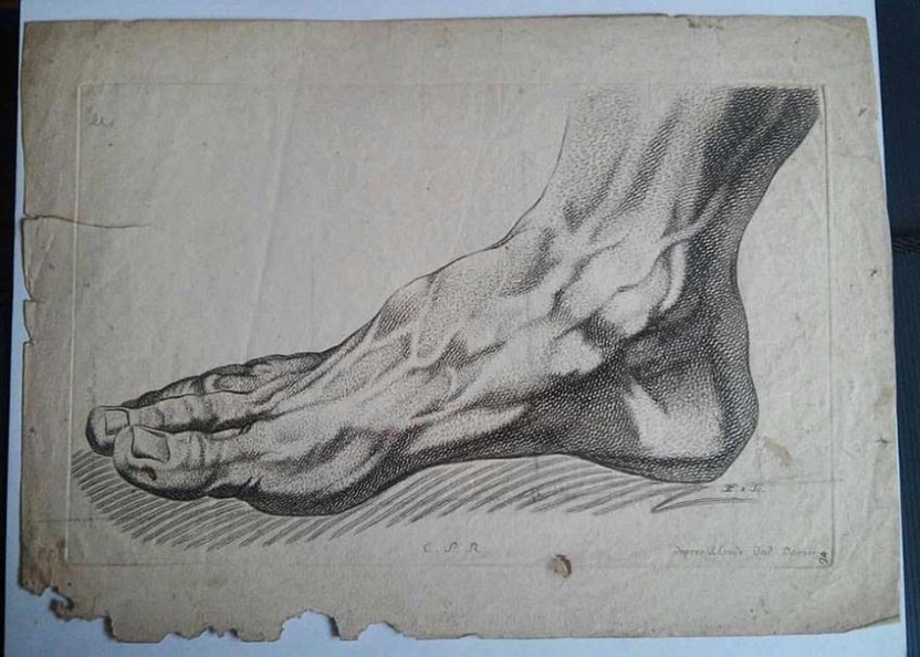 Papel de aspecto envelhecido (cor amarelada, bordas deterioradas) contendo a figura de um pé humano desenhado em grafite de maneira muito detalhada, representando sombras, unhas, veias, curvas e demais detalhes da forma.