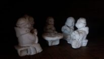 Bonequinhos de resina, sentados em volta de uma mesinha jogando cartas.