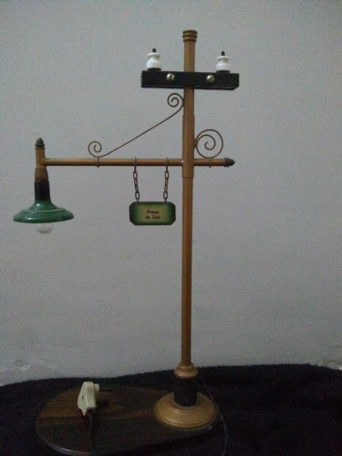 Maquete de um poste de iluminação antigo, feito de materiais recicláveis. Colorido em tons de branco nos suportes que passam os fios de alta tensão, preto na madeira onde se encontra os suportes de fios, verde azul a lamparina e o resto da estrutura em marrom claro.