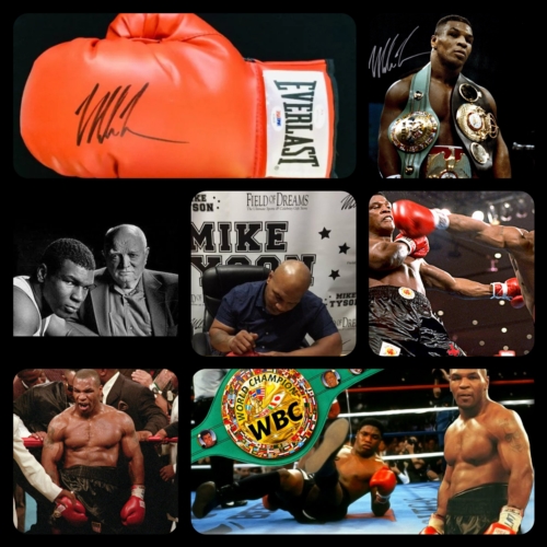 Luva de boxe na cor vermelha. Possui uma assinatura (do lutador Mike Tyson) feita com caneta preta no centro da luva e a seguinte descrição no punho "EVERLAST".