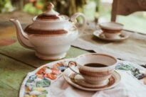 Conjunto peças de porcelana branca com detalhes em marrom e dourado, jogo de chá.