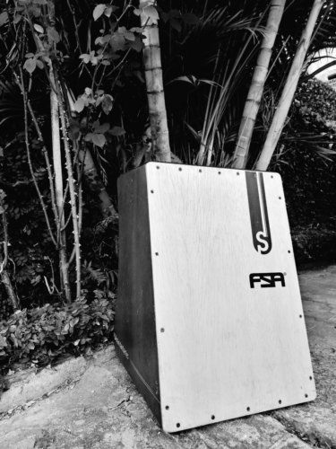 Cajon elétrico feito em madeira com detalhes na cor preta. Possui a sua marca na cor preta no seu bumbo "FSA".