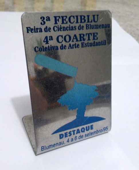 Esse troféu foi recebido por um trabalho apresentado em uma feira de ciências em Blumenau em 1995. O trabalho foi apresentado por mim, Juari Laforce e meu amigo Mauricí Imroth. O título do trabalho era "Modelo Matemático para Tensão Superficial da Água." Com esse destaque, fomos representar Santa Catarina na Feira Nacional de Ciências em Tangará da Serra – MT. Ao nosso projeto, foram incorporados então também análise da Turbidez e Condutibilidade da Água e seus respectivos modelos matemáticos. Hoje sou professor de Inglês e esse objeto me remete a um passado repleto de conhecimento e descoberta. Um passado permeado pela curiosidade semeada por nossos professores orientadores Henrique Breuckmann, já falecido e seu esposa Marlene Lins. Ora, que fascínio dois adolescentes poderiam ter por um conhecimento tão distante e ao mesmo tempo tão presente em suas realidades. Hoje, tento semear essa curiosidade e inquietação em meus estudantes. Tento mostrar que o mundo é mais do que seus olhos podem ver. E esse objeto me desperta todas essas lembranças…