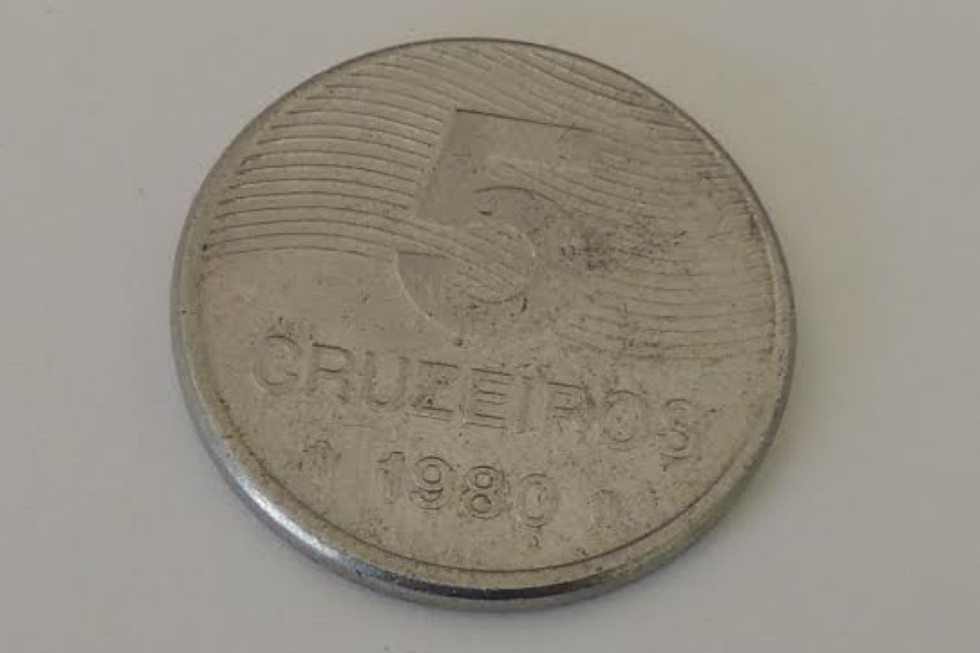 É uma moeda um pouco antiga, é uma moeda de 5 Cruzeiros. Ela tem mais de 36 anos, ganhei ela quando eu era criança de meu avô. Atrás da moeda há uma flor e um campo de cultivo. Esta moeda me lembra o meu avô que morreu há 2 anos. Já me perguntaram se eu queria vender, mas eu sempre dizia não porque essa moeda me lembra de como é o meu avô.