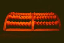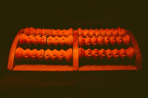 Massageador para os pés feito em madeira. Possui duas divisões e cada uma com três rolos com detalhes esculpidos para massagear.