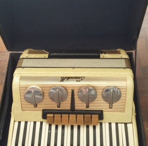 Acordeon Instrumento musical de sopro cujo som é produzido pelo acionamento de foles que produzem uma corrente de ar que atravessa um conjunto de palhetas dentro do corpo do instrumento. Sua estrutura é geralmente confeccionada em madeira dotada de uma caixa e um teclado para as notas agudas, ligados por um fole pregueado à outra caixa com os botões que acionam os baixos. Na fotografia, apresenta corpo na cor bege claro, botões e fole prateados, teclas brancas e pretas, está acondicionado em um estojo preto.