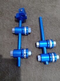 Fixador externo monolateral de metal para fraturas expostas. Possui a cor predominate em tons de azul metálico.