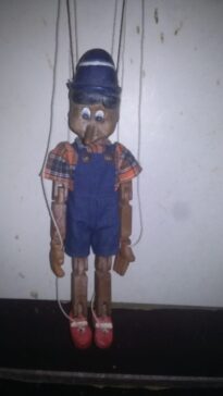 Boneco de madeira articulado tipo marionete, colorido, com o cabelo pintado de preto e os olhos com detalhes nas cores branco, azul e preto, usando um chapéu coco na cor azul com uma linha horizontal branca na parte superior e sapatos vermelho com uma linha horizontal branco na cor branca. Vestindo uma camisa xadrez nas cores laranja, azul e branco e um macacão tipo jeans. Possui quatro cordas que estão ligadas nas suas mãos e nos seus pés.