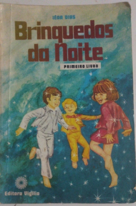 Livro de literatura infantil, capa colorida, em destaque três crianças (dois meninos, um de vestindo um conjunto de roupas brancas a esquerda e o outro de amarelo no centro, e uma menina vestida de rosa a direita) pairando pelo céu estrelado. O título da obra é Brinquedos da noite, da escritora Iêda Dias, da Editora Vigilia.