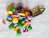 Broche de contas de resina em formato de coração, nas cores verde, amarelo, azul e rosa, todos presos como fosse um buquê de flores por contas minúsculas branco, presas a um suporte de metal amarelo.