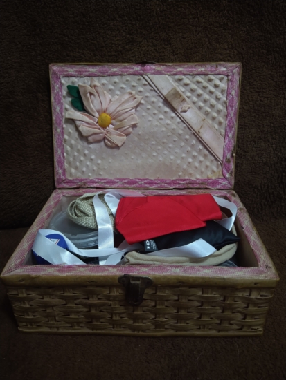 Caixa com tampa presa e fecho. Detalhe interno da tampa, tem uma flor feita com fitas e botão. Aparentemente com função utilitária, no interior da caixa, constam objetos aparentemente relacionados a materiais de costura.