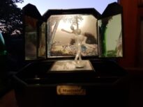 Caixa de música. Possui uma casal de bailarinos em miniatura no centro e 3 espelhos em volta.