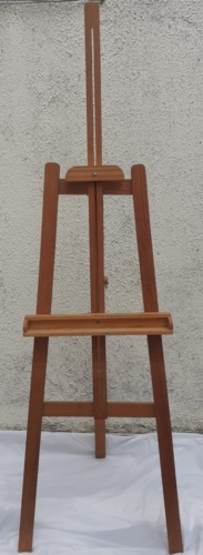 Cavalete para pintura em tela tipo tripé, feito de madeira envernizada, com sistema de regulagem por parafusos de rosca.