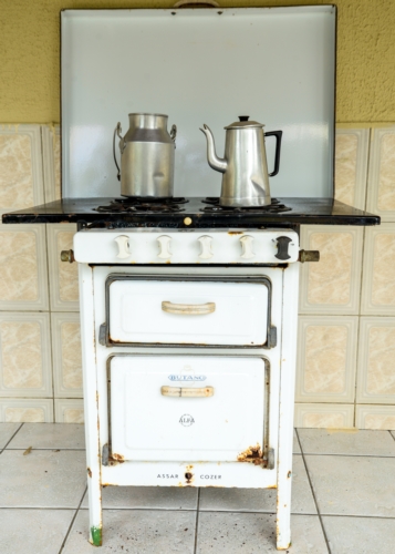 Fogão a gás tipo lenha, todo em ferro esmaltado branco. Possui uma chapa na cor preta com quatro bocas, cinco botões tipo torneira para liberar o gás de cada boca e do forno, duas portas, sendo uma para o forno e outra para lenha.
