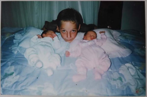 Fotografia onde aparecem três crianças. Dois bêbes estão deitados, aparentemente dormindo, sobre um travesseiro em cima da cama. Entre os dois bêbes há uma criança maior, com a cabeça colocada sobre o travesseiro e posando para a foto. A roupa de cama, o travesseiro e as roupinhas dos bêbes têm um aspecto de maciez.