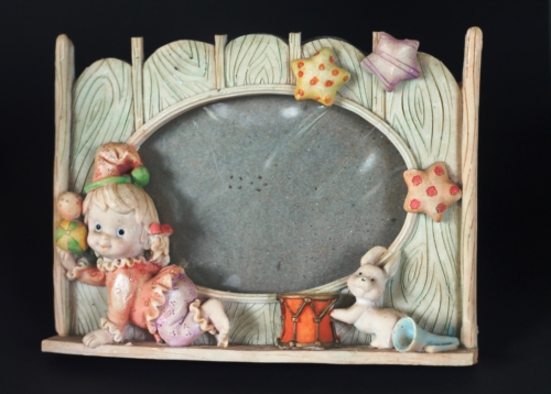 Porta-retratos de cerâmica no formato retangular com detalhes representando uma cerca de madeira, almofadas em forma de estrela, um coelho branco, um tambor laranja e uma de pijama engatinhando. Possui um espaço oval no centro para foto.