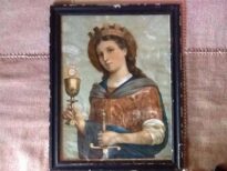 Quadro com imagem de Santa Bárbara que era da minha vó, a Peta - Perpétua Ribeiro Martins. Me criei, sob os cuidados da minha avó, enquanto minha mãe saía para trabalhar, acreditando que essa santa me protegia e que ela amenizava os 'temporais'... Peta era devota e essa imagem esteve sempre sobre a cabeceira da cama dela e do meu avô, Firmínio; ela fazia sempre cruz de sal em dias de tormentas, pedindo que Santa Bárbara abrandasse a chuva... e não é que abrandava mesmo??! [...]