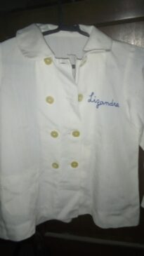 Camisa tipo social para uniforme escolar na cor branca, possui gola, quatro espaços de abotoadura dupla ao longo da camisa, com os botões em coloração transparente. Possui uma inscrição no lado superior esquerdo, em bordado azul escrito "Lizandra" com o formato de letra cursiva.