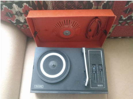 Imagem com fundo claro. No centro da imagem um portador de LP, tipo portatíl, formato retangular, com a cor da base preta e da aste de leitura do LP prateada. A parte de cima é na coloração laranja. Está em cima de um sofá bége.