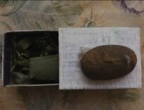 Caixa de fósforo, com a capa pintada de banco, possui folhas ainda verdes no seu interior e uma pequena pedra oval na cor marrom em cima da tampa.