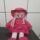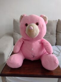Imagem com o fundo claro. No centro há um urso de pelúcia na cor rosa. Possui dois olhos castanhos com o fundo preto e 2 botões na barriga.