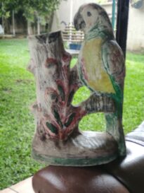 Era a década de 1960. Morávamos na sede do então distrito de Charrua - RS. No interior do distrito (Comunidade de Linha Perondi), havia um professor muito bom (e muito rígido, exigente, disciplinador): Alexandre Dysasz. Meus pais definiram que ele deveria ser meu professor. Fui morar com meus tios (Sílvio e Adelina) e primos (Jandira, Milton e Iraci). Fiquei 4 anos com eles, indo poucas vezes para casa. Não havia ônibus e eram muito raros os veículos que circulavam por lá. Algumas vezes percorri a pé os 10 Km que separavam as 2 localidades para ir ver meus pais/irmãos. Na escola, ao final do ano, os alunos que se destacassem recebiam um prêmio. Como eu sempre fui muito aplicado, sempre era premiado. Esse papagaio/vaso foi o prêmio pelo primeiro lugar do 5º ano, em 1965. Eu o conservo com carinho, pois me remete aos dias difíceis mas também de aprendizado, que me fizeram crescer como pessoa, enfrentando e superando a saudade, a distância e a necessidade de aprender e continuar estudando para crescer na vida.