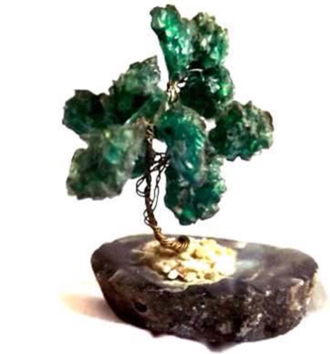 Arvorezinha feita de pedrinha verdes, as folhagens são pedrinhas amarrada com arame e fixada em uma pedra maior redonda com duas cores, uma escura e outra clara.