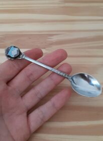 Colher de metal para açucareiro com detalhes na ponta do cabo com uma imagem de um castelo branco no fundo azul, escrito "ISTAMBUL.