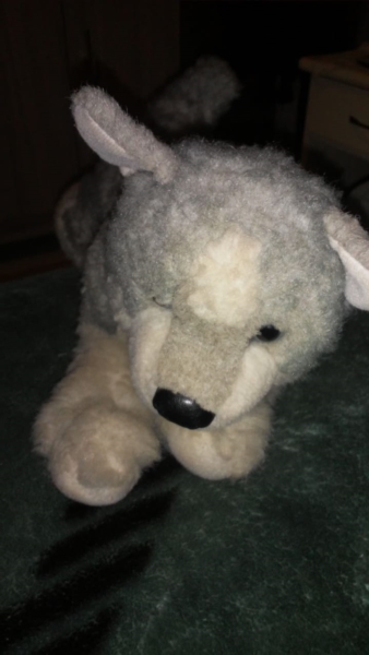 Boneco tipo pelúcia, no formato de um lobo, colorido, com a cor cinza predominante e com as patas e a barrica na cor branca. Possui um focinho e dois olhos de plástico na cor preta.