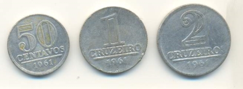 Conjunto composto por três moedas cunhadas em alumínio todas as datas do ano de 1961. Da esquerda para direita temos os seguintes valores escritos "CINQUENTA CENTAVOS", "UM CRUZEIRO" e "DOIS CRUZEIROS.